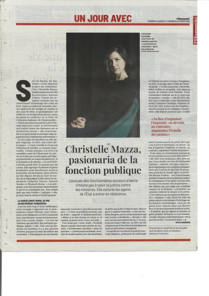 Interview de Christelle Mazza dans l’Humanité du 6 février 2026: son dernier ouvrage, ses engagements au soutien des agents publics et la défense, à leurs côtés, de l’Etat de droit.
